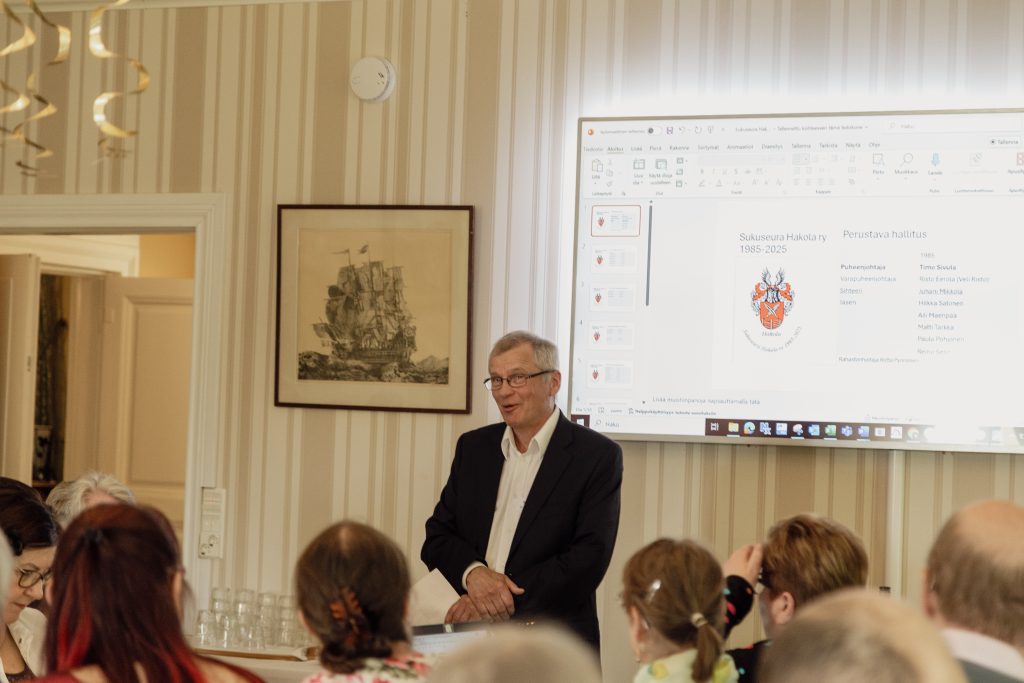 Klo 13:45 Sukuseuran vaiheiden muistelua. Esitelmä seuran vaiheista dokumenttien pohjalta sekä kokousosallistujien muistelua seuran historiasta ja tarinoita.